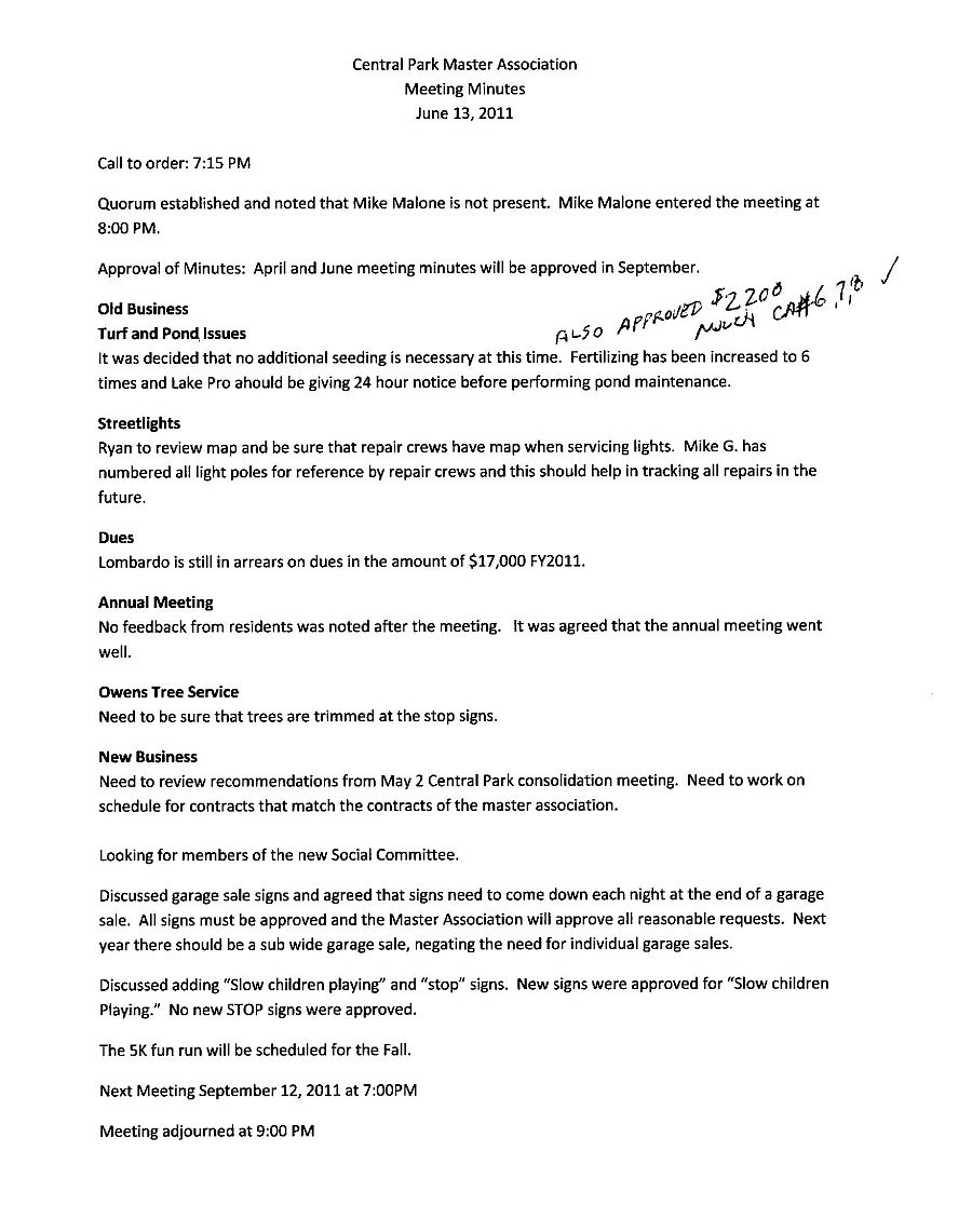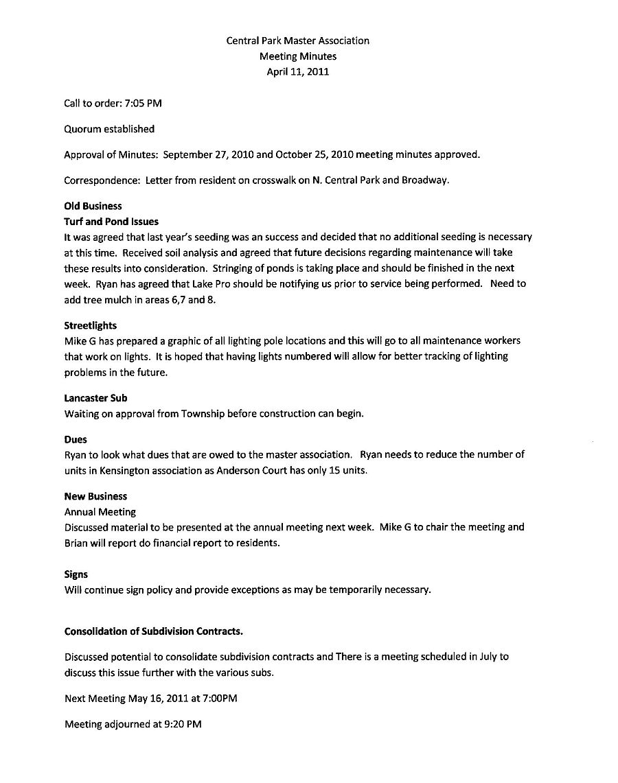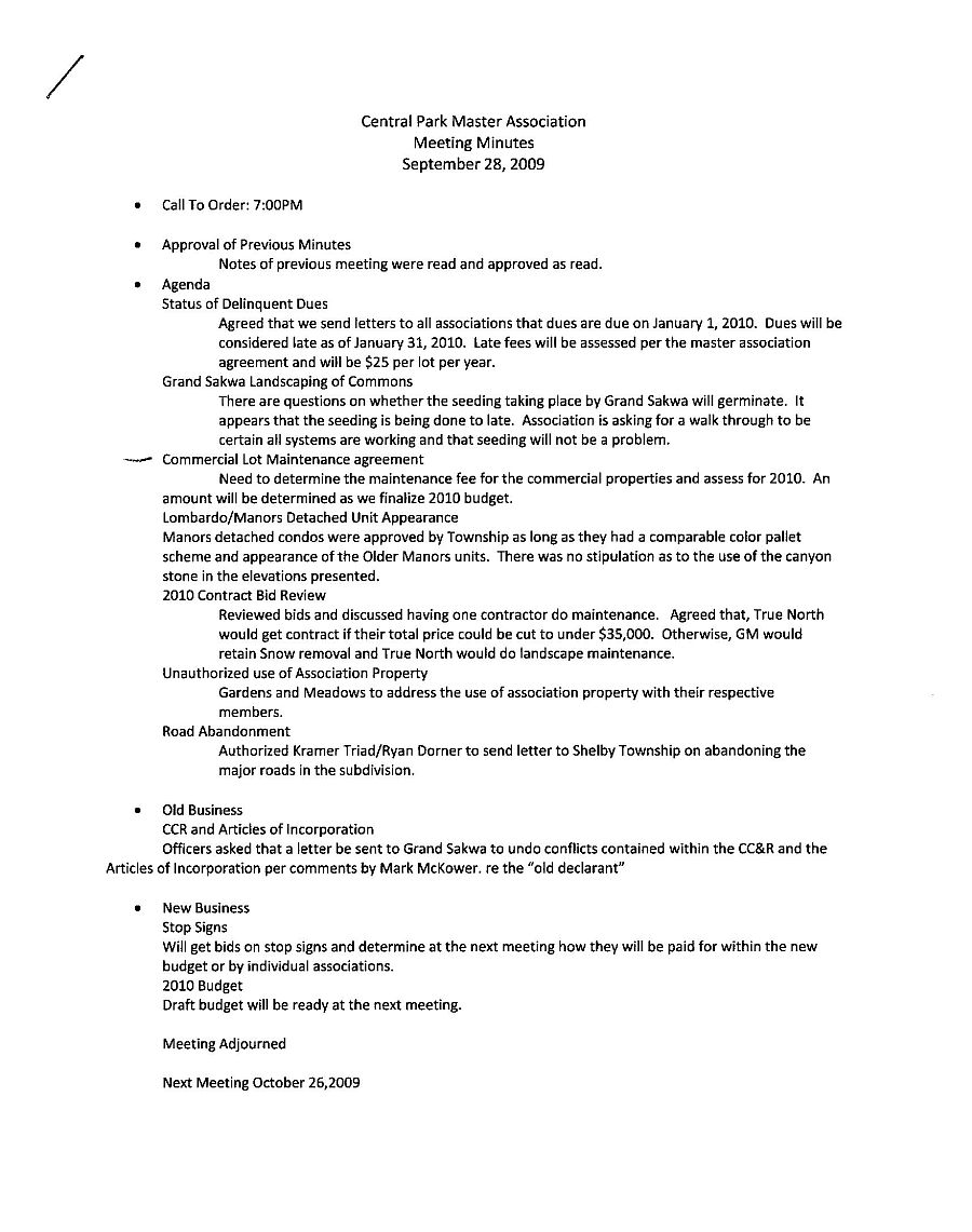 Notes from the Central Park Master Association Board of Directors Meeting of May 28, 2009