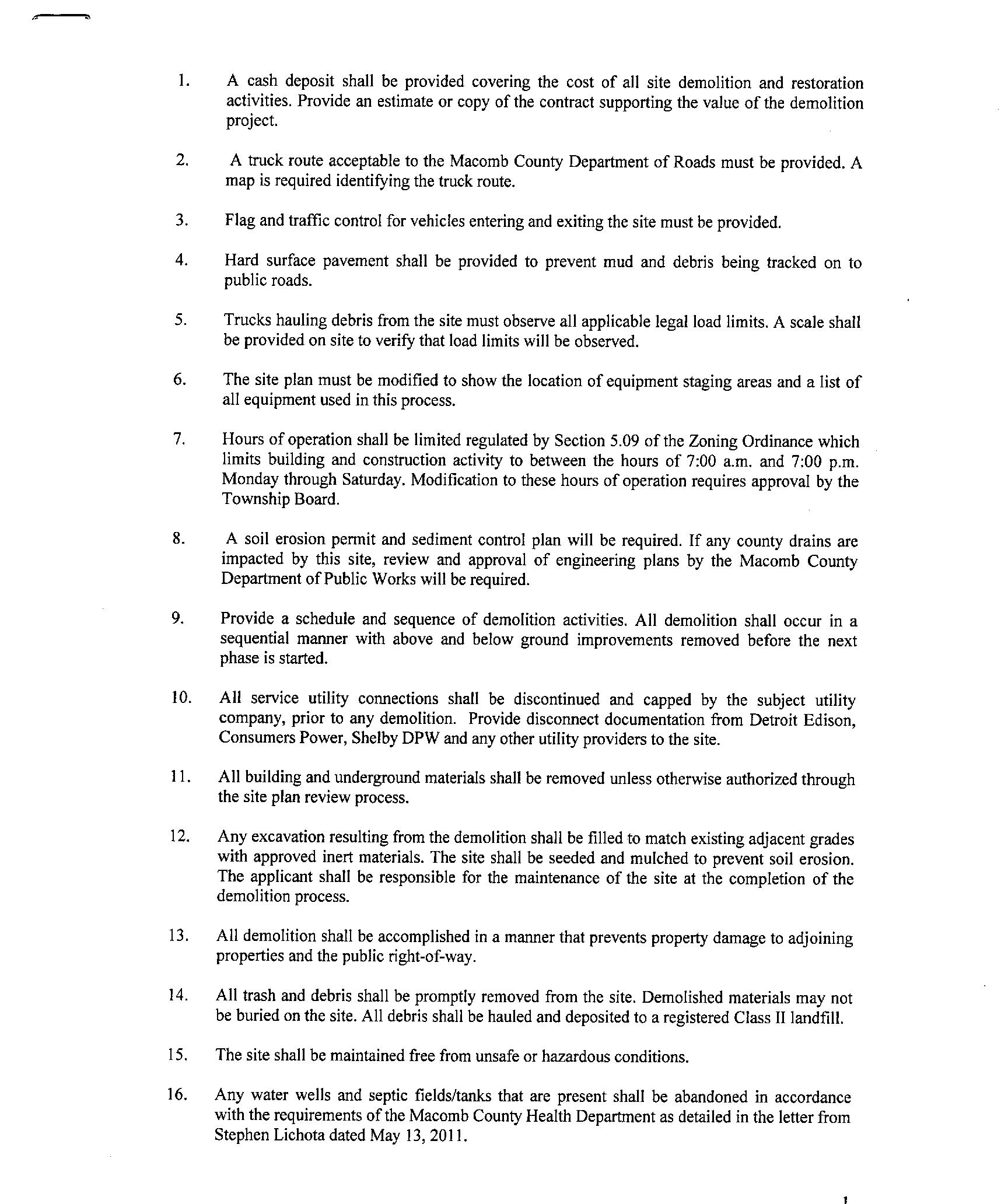 One of the 32 conditions states that demolition work is limited to "the hours of 7:00 a.m. and 7:00 p.m., Monday through Saturday. Modifications to these hours of operation requires approval by the Township Board."
