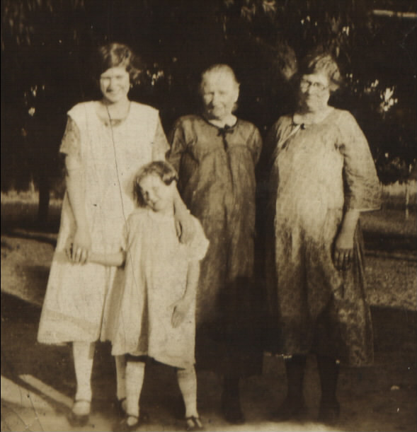 Lucille is barely noticable in this photo taken around June of 1919. Left to right: Catherine Kaltz (with her arms on her sister, Gertrude Kaltz), Helen (Otto) Rotarius (grandmother of the three girls surrounding her) and Helen (Kaltz) Kunath, who is visibly pregnant with Lucille. Helen was married to Mark O. Kunath, Catherine would later marry Clarence Kelly, Gertrude would marry Arnold Measel and then Hamilton Peters. |