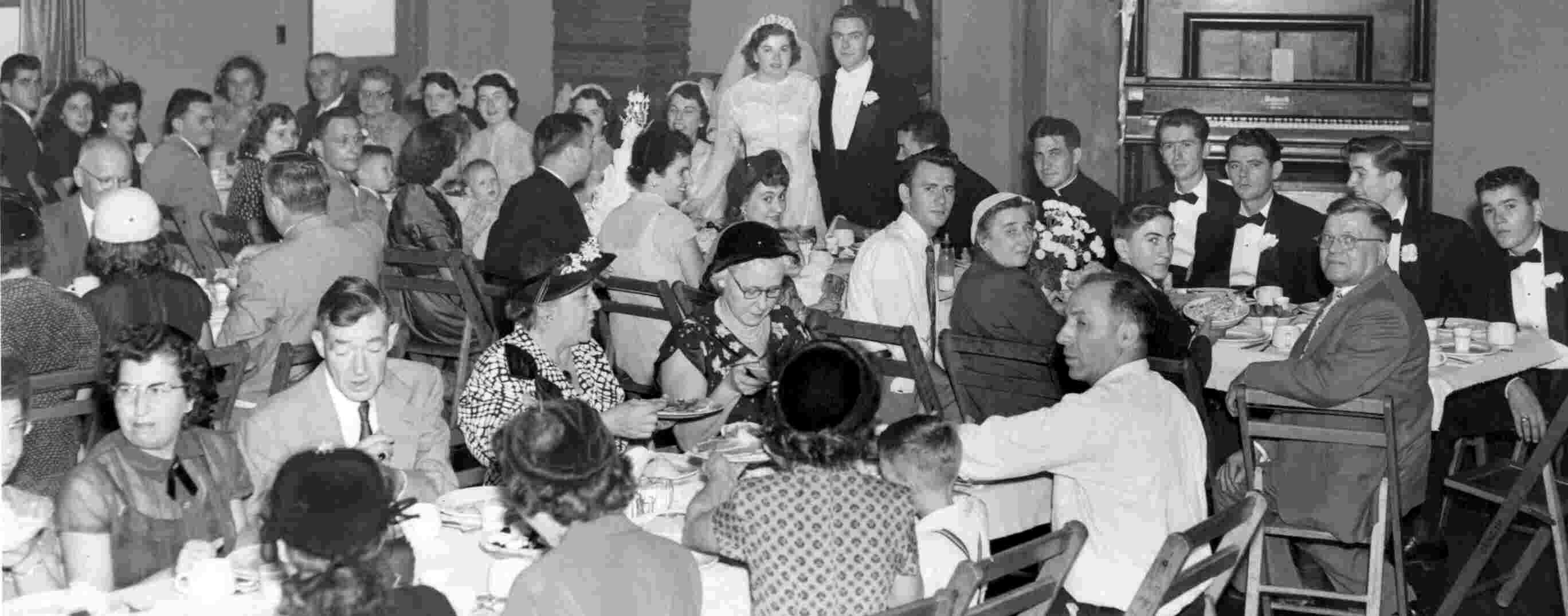 Head Table (clockwise, beginning with the bride): Monica (Grobbel) Burcar, Victor Burcar, Fr. Murray, unidentified priest, Alton "Oz" Grobbel, Bill McCoy, Sylvester Grobbel, Mark A. Grobbel, John Kovac, Larry Kovac, Elizabeth Kovac, Bob Stanczak, Roma Stanczak, Virginia (Hiller) Grobbel, Vincent Grobbel, Gary Moscone, Mary Ellen (Grobbel) Moscone, James Moscone, Julio "Shorty" Moscone, unidentified woman, Barney Carney, Irene Carney, Barbara (Carney) Roberts, Don Roberts, Victor Burcar, Sr., Ann Burcar, Clement Grobbel, Roxanna (Kennedy) Carney Grobbel, Rita "Mary" (Hobbs) Grobbel, Mary Frances "Sis" Bentley, Joyce Burcar, Leontine "Lee" Grobbel.