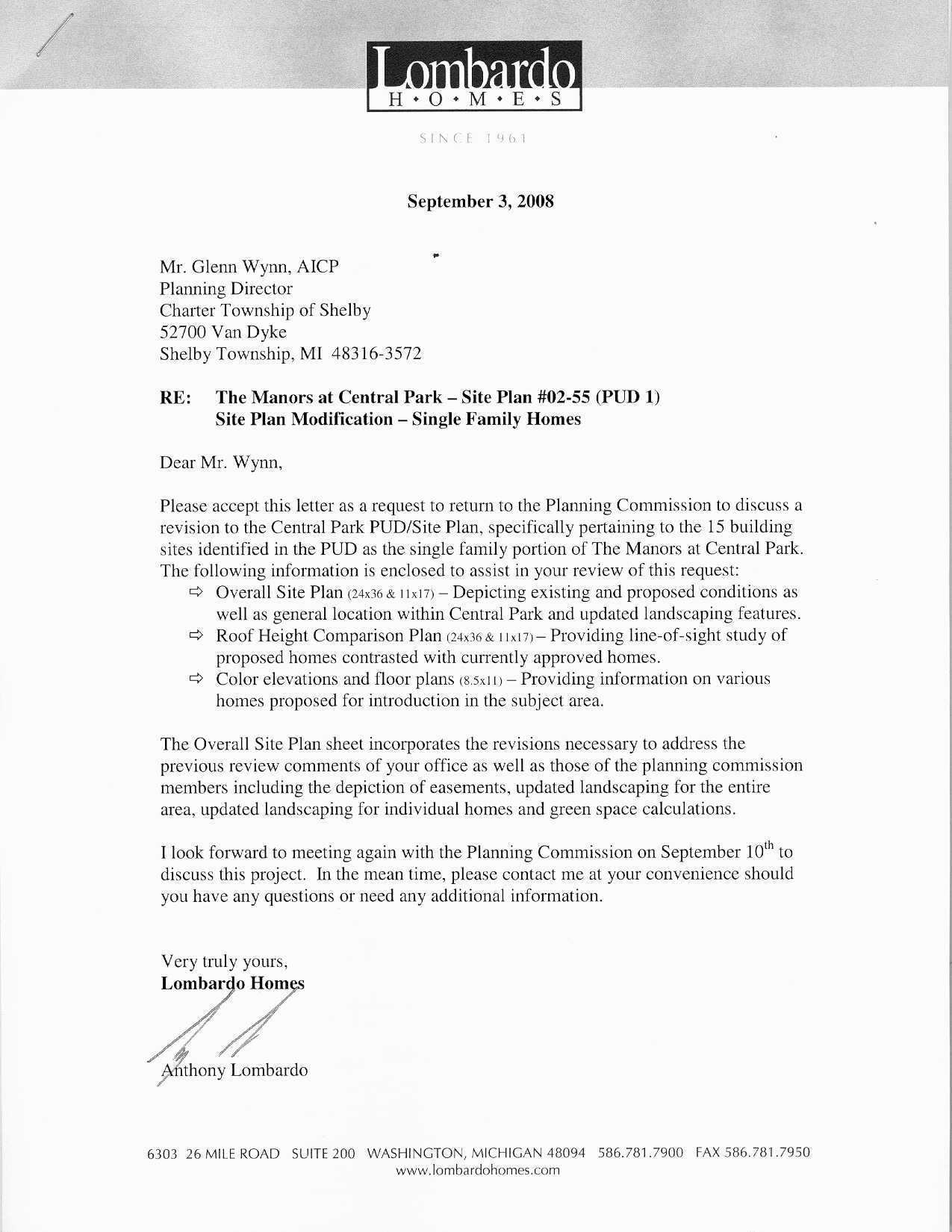 The following Site Plan modification request documents were submitted by Anthony Lombardo to the Shelby Township Planning and Zoning Department on Sept. 3, 2008: