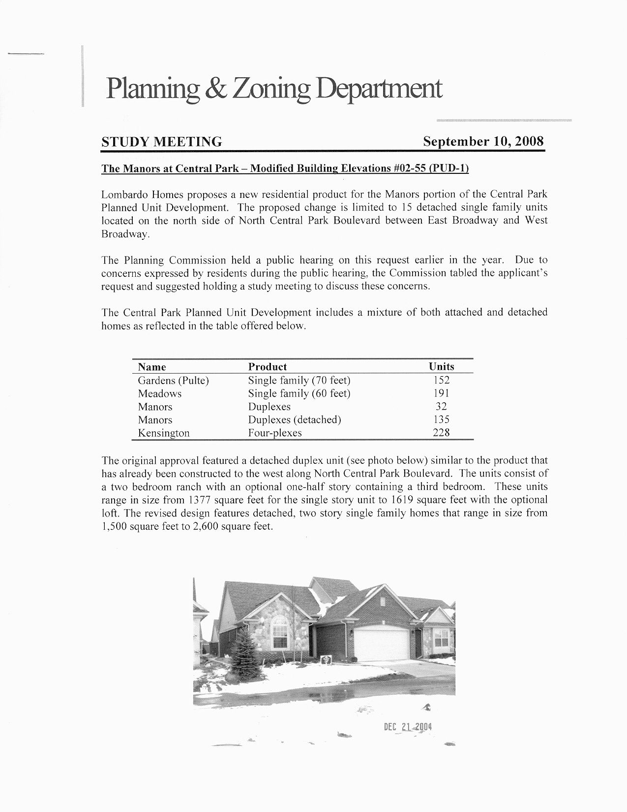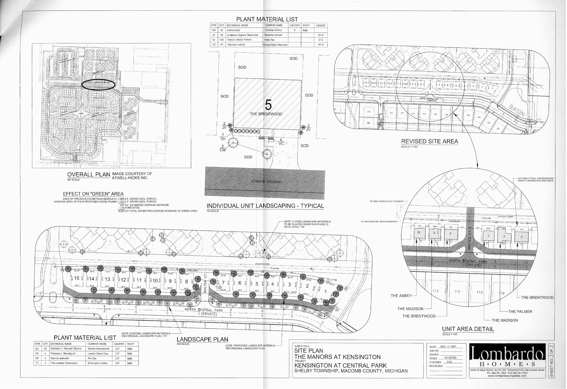 On Feb. 27, 2008, a public hearing was held by the Shelby Township Planning Commission regarding a request by Lombardo Homes for a Site Plan modification of the approved building elevations for Lots 1-15 [map] of the Manors at Central Park Condominum development. The approved elevations for Lots 1-15 are ranch style, single-story detached condos and the petitioner is proposing a change to allow two-story detached condos to be built there instead. Following the petitioner's presentation at the public hearing, numerous residents of the Central Park community spoke in opposition to the proposal. Following the Planning Commission's discussion, the Commission voted to table the proposal for future consideration.