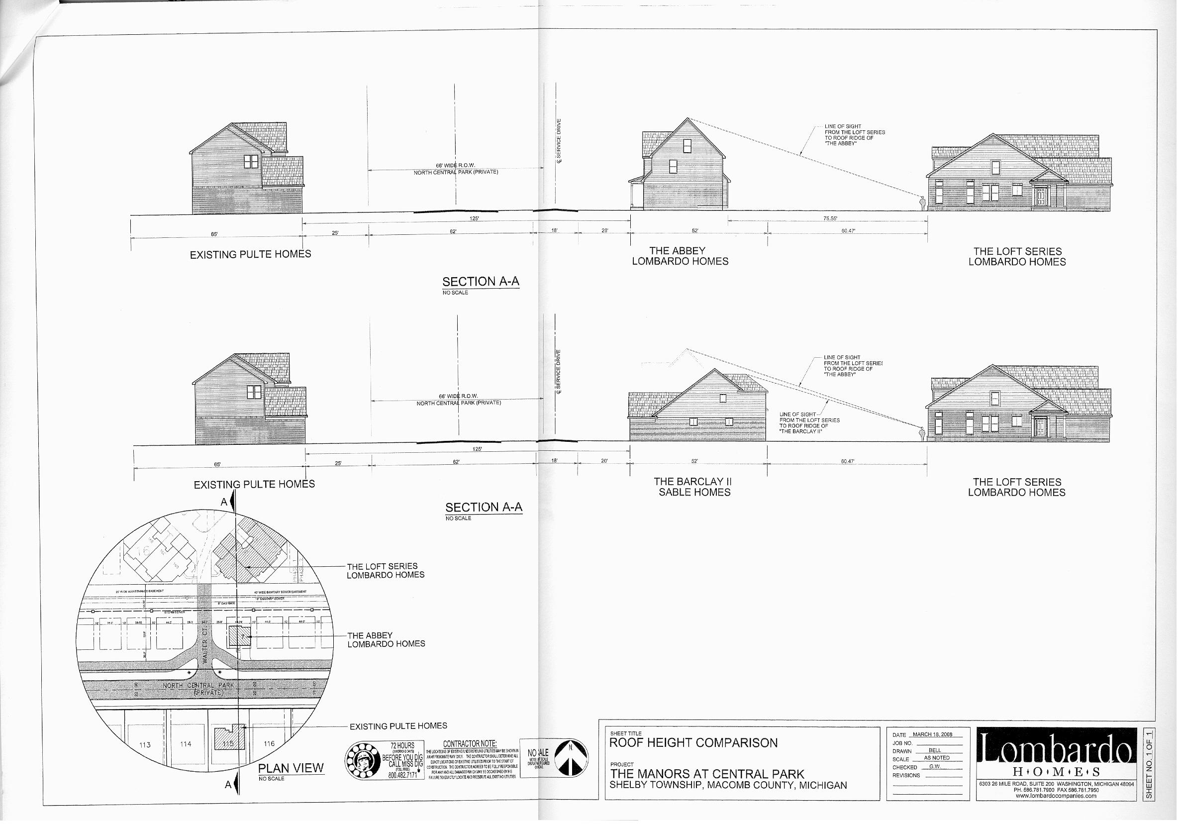Roof Height Comparison - A Sable "Barclay" ranch model (with optional loft) and a Lombardo "Abbey" two-story model are compared to a proposed Lombardo Loft series building and and existing Pulte two-story home; also includes a rear view "line of sight" comparison between the "Barclay" and "Abbey" as viewed from a proposed Lombardo Loft series building.Illustrations: